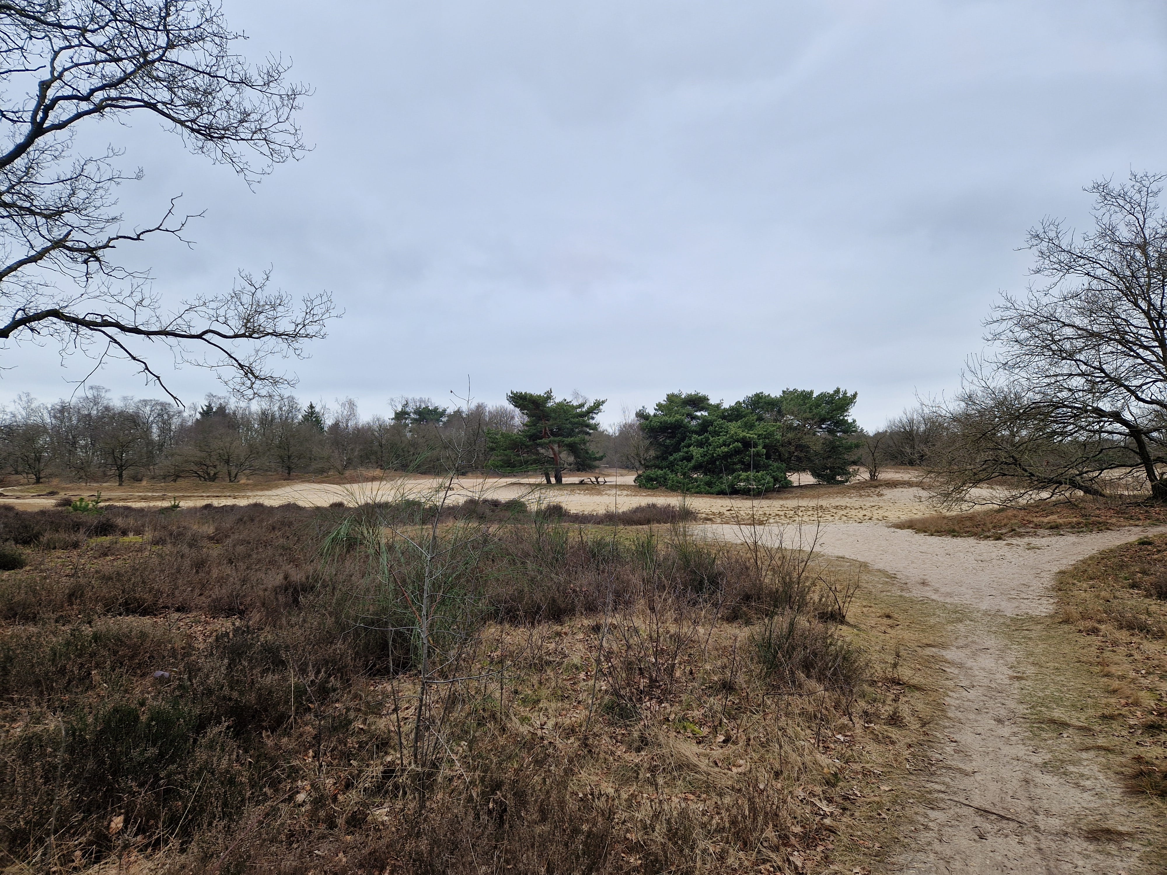6. Steek deze zandvlakte bijna recht (beetje links aanhouden) over. U gaat voor het prikkeldraad links. Bij T-splitsing links aanhouden.