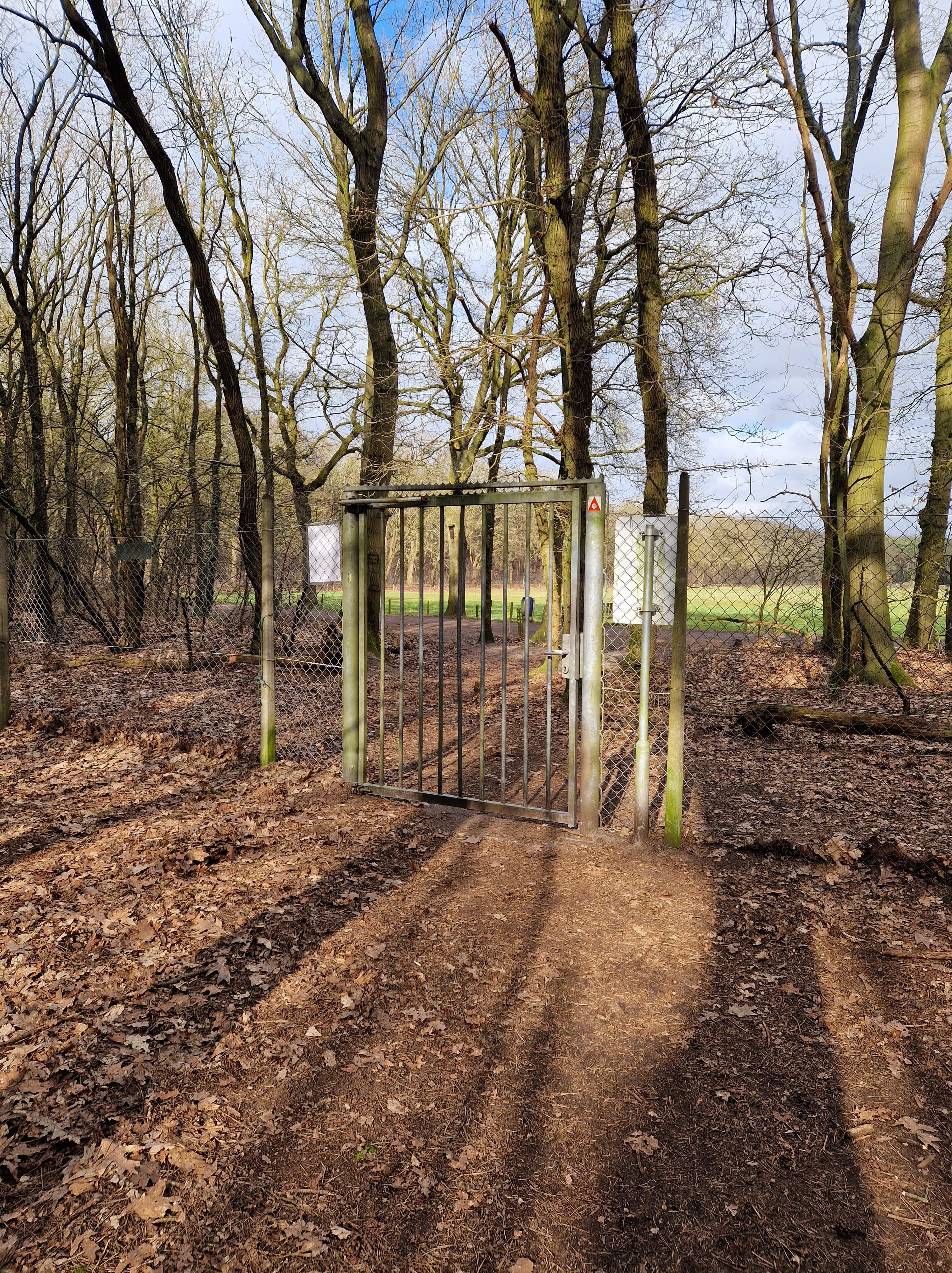 14. We vervolgen de blauwe route tegenover de picknicktafels. Na een bocht loopt u rechts door het hek. Sluit u het poortje weer goed?